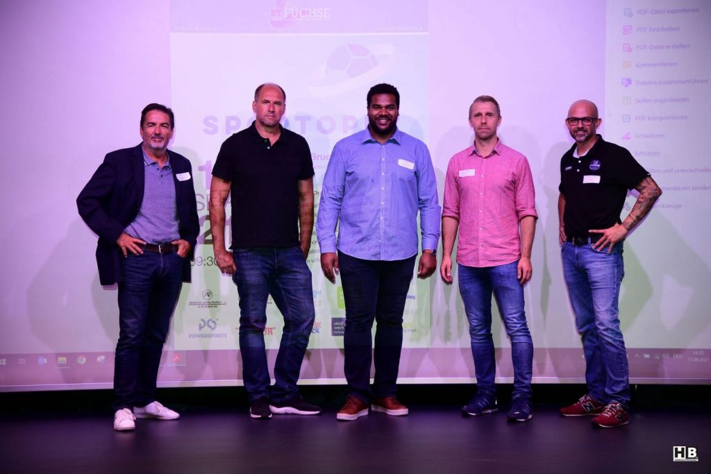 vlnr: Heinz Rumpold (Obmann BT Füchse), Jörg Meixner (Umweltbundesamt), Cedric Mayer (Moderator), Karl Heinz Weiland (Vizeobmann BT Füchse), Christian Rahm (Vizeobmann BT Füchse) Foto oben: Georg Pangl (Pangl Football Group) Fotocredit: 2x Bernd Haider (BT Füchse)